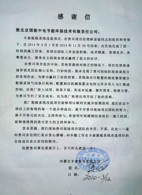 當(dāng)前位置: 國能中電公司動態(tài)> 內(nèi)蒙古豐泰脫硫系統(tǒng)改造EPC項目受業(yè)主表揚
