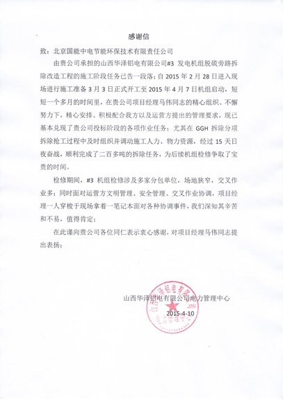 當(dāng)前位置: 國能中電公司動態(tài)> 山西華澤鋁電旁路改造EPC項目受業(yè)主表揚