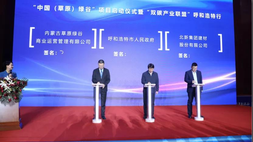 盤古智庫(kù)秘書長(zhǎng)、中美綠色基金CEO王俊灃,呼和浩特市副市長(zhǎng)張永文、北新建材董事長(zhǎng)王兵進(jìn)行三方簽約