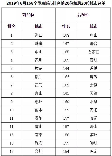 2019年6月,168個(gè)重點(diǎn)城市中唐山、邢臺、石家莊市等20個(gè)城市空氣質(zhì)量相對較差(從第168名到第149名);???、珠海、中山市等20個(gè)城市空氣質(zhì)量相對較好(從第1名到第20名,見附表1)。
