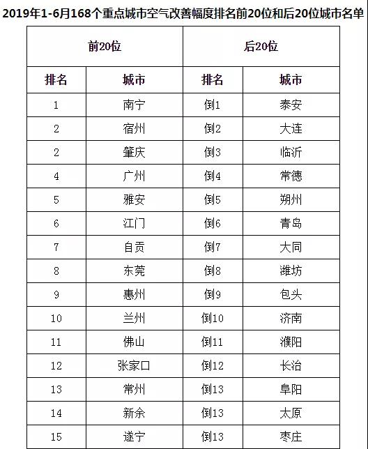 從空氣質(zhì)量同比改善程度看,2019年1-6月,168個(gè)重點(diǎn)城市中南寧、宿州、肇慶市等20個(gè)城市空氣質(zhì)量改善幅度相對較好(從第1名到并列第19名);泰安、大連、臨沂市等20個(gè)城市空氣質(zhì)量改善幅度相對較差(從倒數(shù)第1名到倒數(shù)第20名,見附表3)。